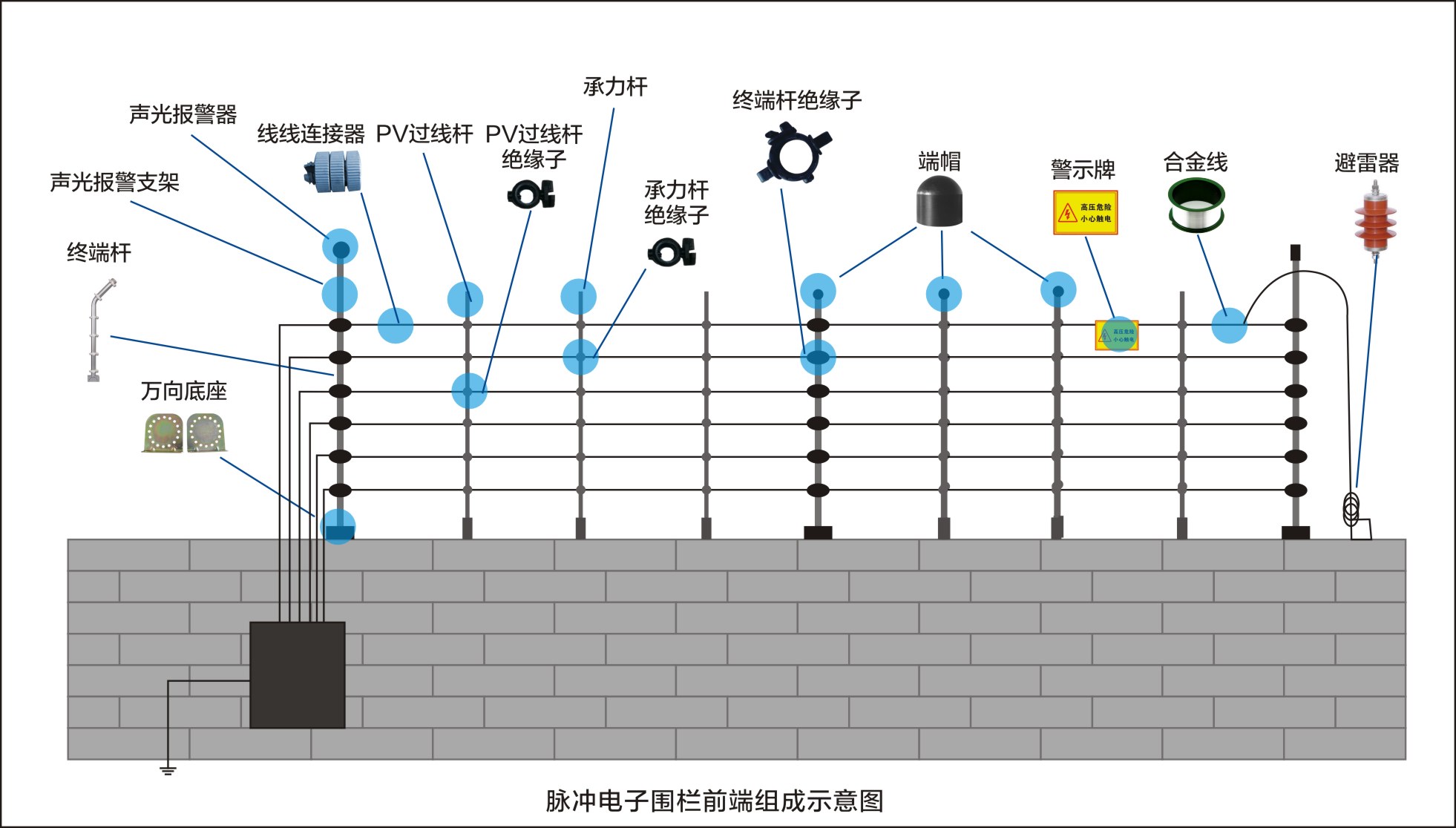 脈沖電子圍欄探測主機發(fā)出可控的高壓電脈沖,輸送到電子圍欄前端,通過末端跳線形成回路,脈沖電子圍欄探測器通過監(jiān)測前端脈沖電流是否有短路或斷路情況來判定是否發(fā)生入侵。發(fā)生入侵時探測器觸發(fā)報警并將報警信號傳輸至相應聯(lián)動裝置。