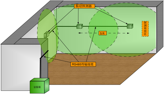 VDS-210-a智能入侵探測器適用于室內實體墻,例如磚墻、水泥墻、混合實體墻等,防砸、防破壞,建議布設距離為每3~6米一套。智能入侵探測器通過RS485總線與智能入侵探測主機通信,實時上傳墻體振動數據,并由智能入侵探測主機完成對探測器數據的融合分析處理,最終實現報警事件的判斷及報。