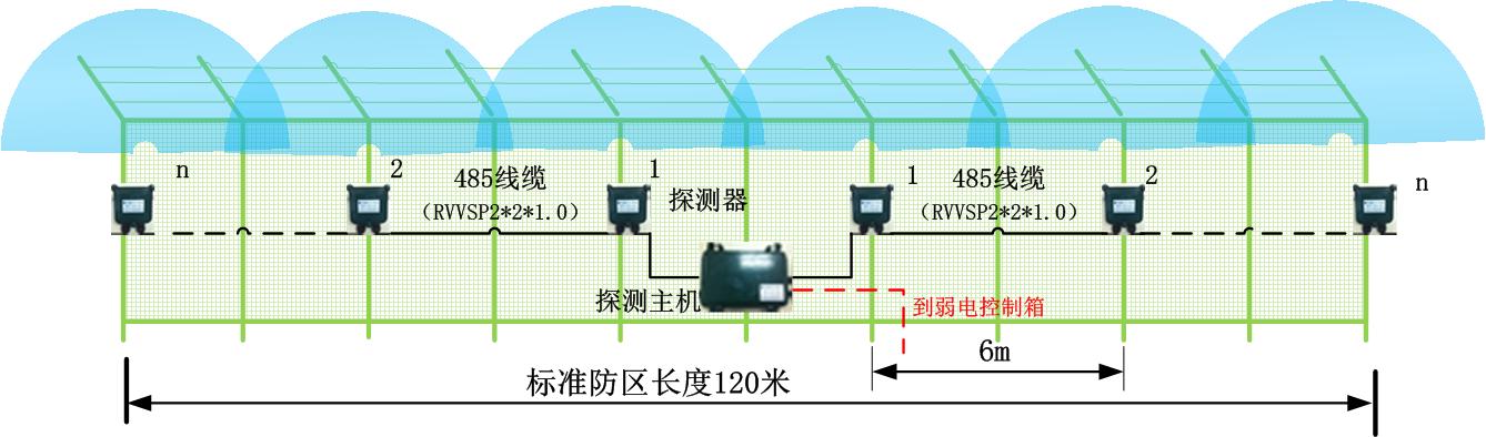 系統(tǒng)在一個(gè)探測(cè)器節(jié)點(diǎn)內(nèi),同時(shí)集成了微波雷達(dá)探測(cè)器和MEMS振動(dòng)探測(cè)器兩種入侵探測(cè)技術(shù),其中微波雷達(dá)探測(cè)在圍欄外側(cè)形成一道虛擬警戒區(qū)域,人員或車輛在預(yù)警區(qū)域內(nèi)移動(dòng)時(shí)系統(tǒng)產(chǎn)生入侵預(yù)警,微波雷達(dá)的探測(cè)距離為10米。MEMS振動(dòng)探測(cè)器檢測(cè)圍欄上由于敲擊、撞擊、搖晃、攀爬等行為引起的振動(dòng)信號(hào),并據(jù)此產(chǎn)生入侵報(bào)警,其有效探測(cè)距離為0~6米。探測(cè)器采用壁掛方式布設(shè)在圍欄上,探測(cè)器之間通過RS-485總線相連,并匯聚到探測(cè)處理主機(jī)。此方案融合微波雷達(dá)和MEMS振動(dòng)兩種入侵探測(cè)技術(shù),兼具主動(dòng)和被動(dòng)探測(cè)方式,具有預(yù)警距離遠(yuǎn),定位精度高,適應(yīng)性強(qiáng),易于安裝和調(diào)試等特點(diǎn),適用于民航、物流、石油、電力、煙草、公安、司法等行業(yè)。