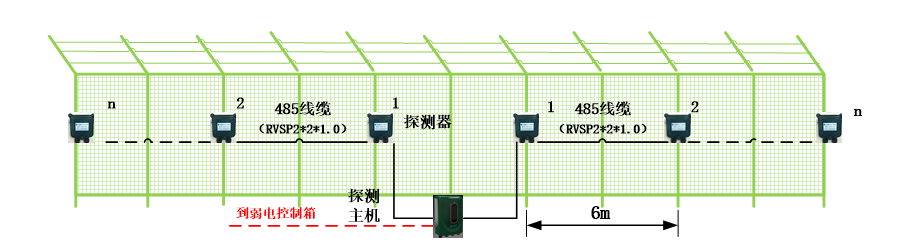 VDS-210振動入侵探測器適用于單層圍欄區域或雙層圍欄區域的鋼筋網圍欄,建議布設距離為每6米一套。智能探測器通過RS-485總線與探測主機通信,實時上傳圍欄上的振動數據,并由探測主機完成多個探測器數據的融合分析處理,最終實現報警事件的判斷及上報。