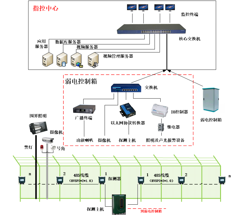 指揮中心安防系統(圍界安防集成管理平臺軟件)由周界防入侵系統控制中心服務器、視頻存儲陣列、監控報警平臺軟件、視頻儲存及管理軟件等組成。通過報警軟件客戶端及視頻管理軟件客戶端,用戶可閱覽各個防區的報警、故障及實時工作狀態,并設置、校核、人工干預控制相關的聯動設備(視頻、廣播、照明等),完成報警集中處置。