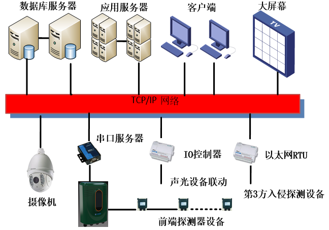 集成平臺采用現代多媒體及數字化監控技術,通過通信網絡平臺和管理服務器、管理軟件等形成周界安防報警融合處理平臺,實現對傳感器入侵探測子系統、智能視頻監控及分析子系統、廣播通信子系統、智能照明子系統的信息集成。按照物聯網體系的感知層、傳輸層和應用層進行劃分與組織,形成1個平臺與多個子系統的有機集成,實現由監控中心對全系統的信息集成和統一管理。