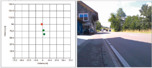 (圖-5、雷達(dá)圖疊加視頻圖像,紅色為趨近,綠色為遠(yuǎn)離,坐標(biāo)為距離)