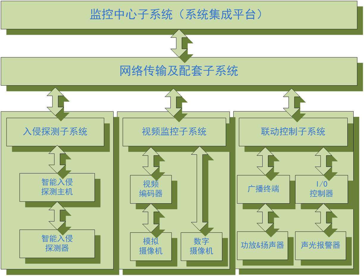 系統由五個部分組成,分別為前端探測子系統、視頻監控子系統、聯動控制子系統、網絡傳輸及配套子系統、控制中心子系統(系統集成平臺),如下圖所示: