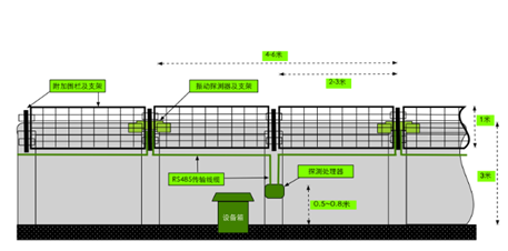 此方案在磚墻頂部增設高度約為1米的鋼絲圍欄,并在圍欄上布設振動入侵探測器,振動入侵探測器采用加速度傳感器。探測器布設距離為6米,安裝高度距墻頂部為0.5米。此方案主要用于圍墻攀爬、翻越、圍欄剪切等入侵行為,同時還可以可探測砸墻、鑿洞等針對實體磚墻的破壞行為。鋼絲及立柱采用不銹鋼材質。此方案的優點是能夠結合實體防護和技術防范;缺點是鋼絲容易老化松弛,導致使用效果變差,需要定期對鋼絲進行緊固操作,增加了維護日常維護工作量。此方案在江蘇無錫大橋中學(1.5km)有應用案例。